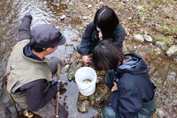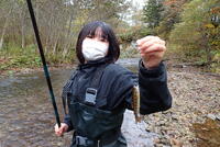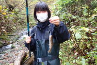 各自で自作した仕掛けを竿にセットして、釣りスタートです。イクラを餌にすると、次々に小さなヤマメが掛かります。でも…目的のオショロコマの姿がありません。本流から支流、そして沢に入っていったんでしょうか?小さな流れ込みを遡ると小さなヤマメがたくさん泳いでいるのがわかります。そして、仁科さんがオショロコマの姿を見つけてくれました。釣りでは難しそうだったので、ガサガサに変更です。全員で協力して、ようやく1匹のオショロコマを捕まえることができました。