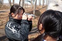 長靴にスノーシューを装着、春のちょっと締まった雪原をスノーシューで進んでいきました。森に入ると早速足跡が・・・。キツネかな?みんなで想像力を働かせ、どっちに行ったか、何していたのか考えてみました。