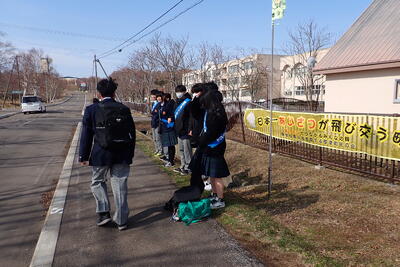 標津町内では、4月7日から朝の挨拶運動が始まっています。本校生徒会及び有志生徒は学校前交差点であいさつ運動を