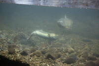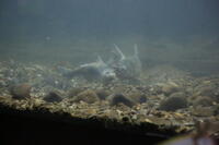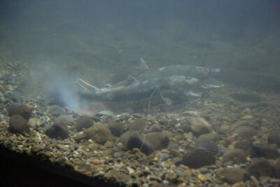 魚道水槽の前で、館長の市村さんからサケの産卵に関する講義をいただきました。雌がどのように産卵場所を選び、産卵床を作り上げるのか、科学的な知見から詳しく説明をいただきました。ペアリングしているサケは、講義の間も産卵行動を繰り返し、雌に寄り添う雄、産卵床を確かめる雌、そして、お互いのタイミングを見計らって、バッチリ目の前で産卵を見ることができました。