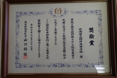 11月27日標津町生涯学習センターあすぱるで行われました令和7年度標津町表彰式に参加いたしました。本校で続けている防災減災活動が認められ、令和7年度標津町「教育文化奨励賞」を受賞いたしました。町からの名誉ある表彰いただき、感謝申し上げます。これからも地域に根差した防災減災活動を継続し、地域循環型防災教育を推進してまいります。