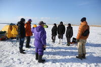 2月4日(水)5,6時間目、本日は、野付半島に広がる野付湾でアイスフィッシングの授業でした。野付湾が結氷し、地元の人は氷上のチカ釣りを楽しむシーズンになりました。標津高校自然環境系コースでは、藻場学習から海の生態系の学びを続けてきました。本日は、その中でも氷の下の生態系を観察する授業です。