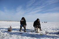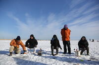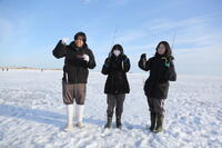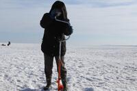 お世話になったのは、標津ガイド協会の皆さまです。水平線まで真っ白になっている野付湾、雄大な自然の中で釣り開始です。まずは、ドリルで穴を開けて・・・仕掛けに餌をつけて・・・スタートです。仕掛けを垂らすとすぐに反応があり、きれいなチカが釣れました。